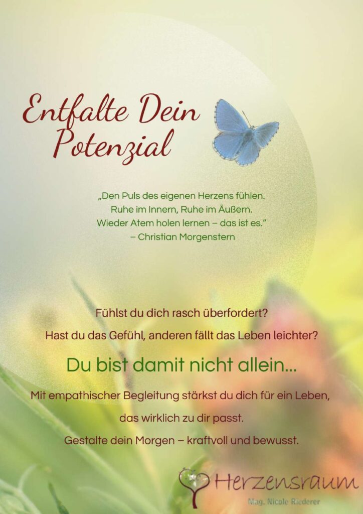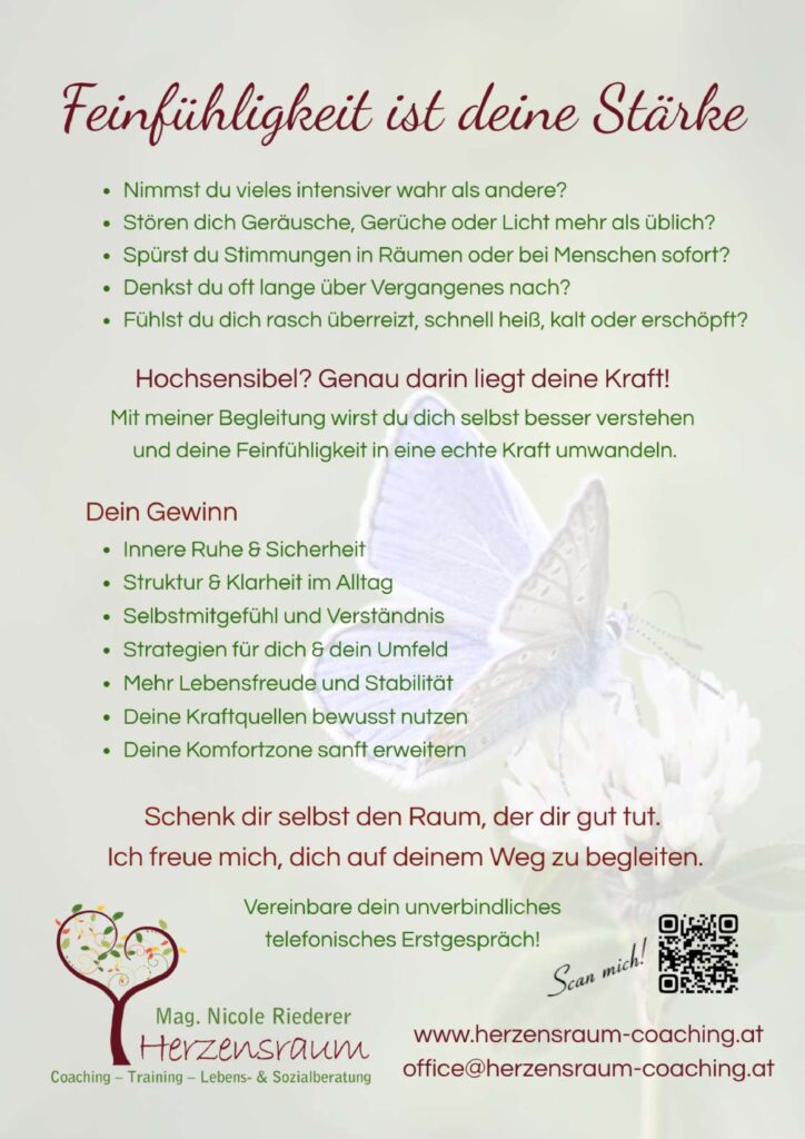 Als Coach und diplomierte Lebens- & Sozialberaterin biete ich insbesondere hochsensiblen Frauen und Müttern meinen vertraulichen und wertfreien Herzensraum zur Entfaltung ihrer feinsinnigen Potenziale – für mehr Lebensfreude, Balance, persönliches Wachstum und Wieder-Selbstfindung. Ganz im Einklang mit ihrer Familie.